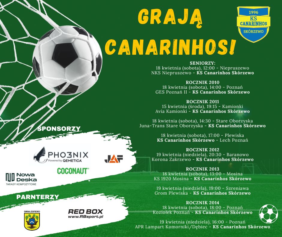 Zapraszamy do zapoznania się z weekendowym rozkładem meczów najstarszych grup Canarinhos. Weekend ponownie rozpoczynamy już w środę, tym razem jako pierwsi zagrają zawodnicy z rocznika 2011. Ligowe zmagania zakończą gracze z rocznika 2012 wyjazdowym spotkaniem z Koroną Zakrzewo: